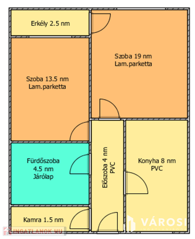Helyiségei: 2 külön nyíló szoba, konyha, kamra, fürdőszoba, előszoba, erkély.