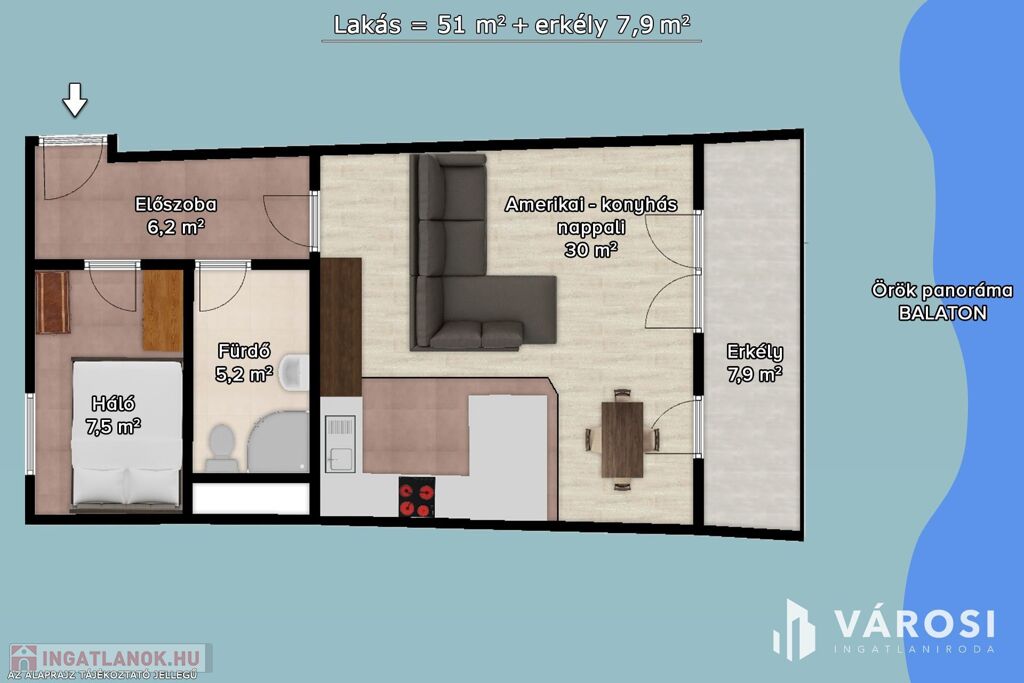 A lakás nappali + 1 hálószobás, alapterülete 51 m2, amihez egy 8 m2-es örökpanorámás erkély tartozik.