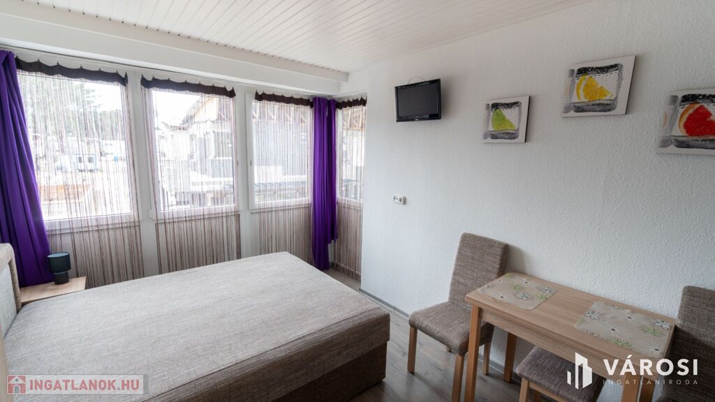 Eladó Siófok Aranyparti részén épült társas üdülő első emeletén lévő balatoni panorámával rendelkező gyönyörű nyaraló. A lakás mindössze 150 méterre található a híres siófoki Aranyparttól. A partszakasz ezen része ingyenes, így korlátlanul élvezheti a Balaton nyújtotta lehetőségeket. Busz- és vasúti megálló, boltok, éttermek pár perc sétára találhatóak. Az ingatlan 2021-ben nagy felújításon esett át, melynek keretében új laminált parketta lett lerakva, valamint a teljes berendezés A-tól Z-ig kicserélésre került.