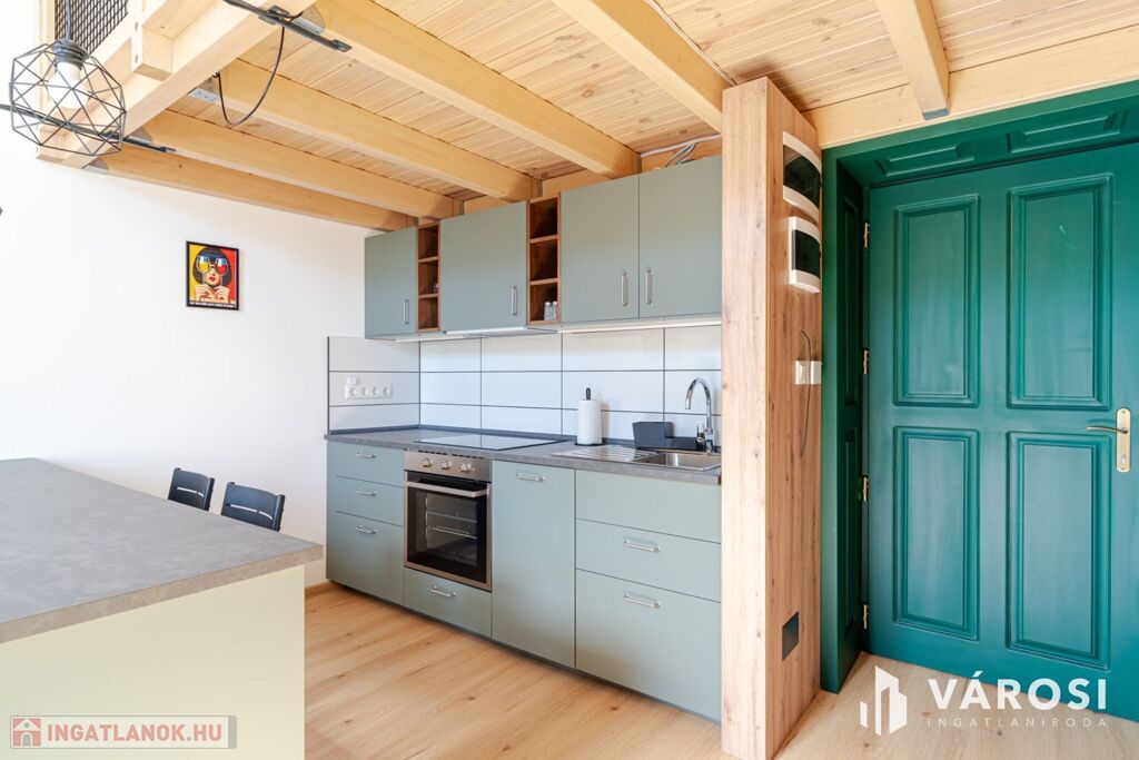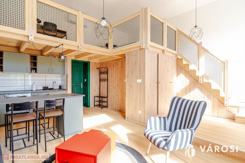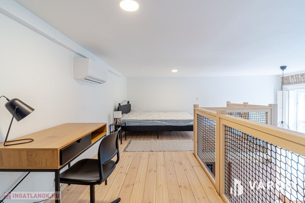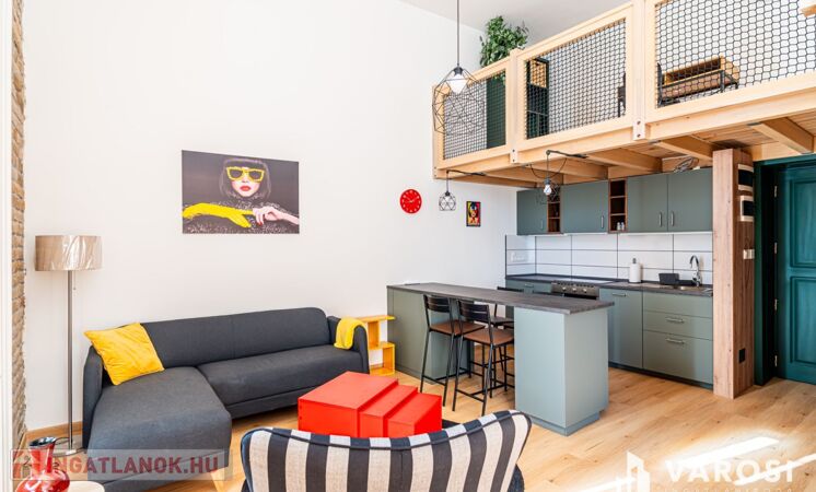 A kisebb lakás (35 m² + 13 m² galéria) galériás megoldással, kreatív beépítésekkel és modern dizájnnal.
