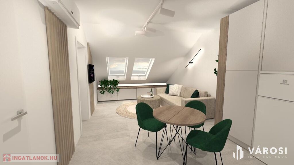 A hirdetésben szereplő lakás 4. emeleti, tetőtéri, 29,73 m2 alapterületű, 7,4 m2 erkéllyel és udvari kilátással rendelkezik.