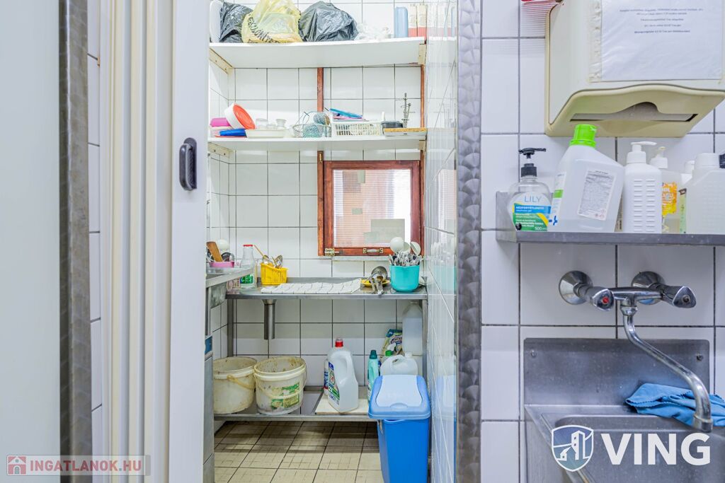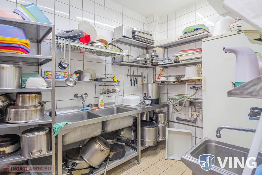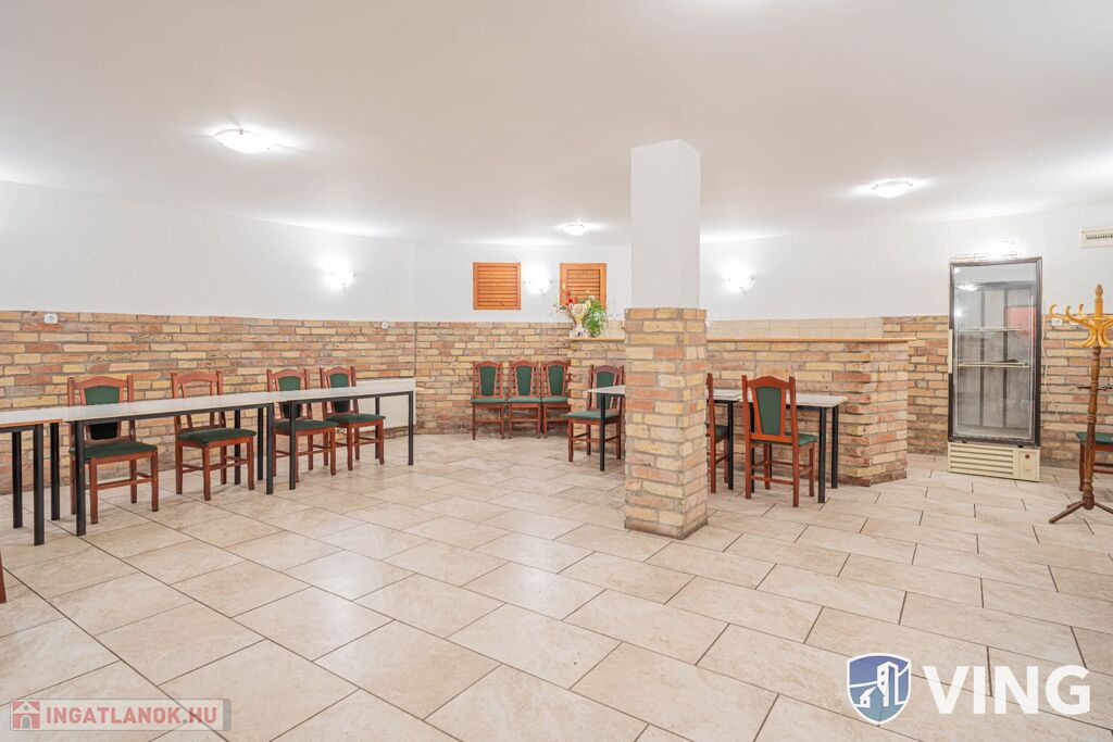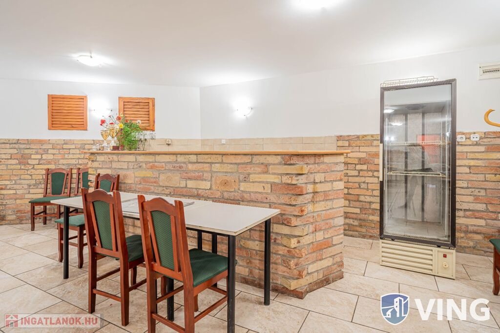 A földszinten egy utcai bejáratos meleg és hidegkonyhás étterem található, amely 42 fő kényelmes befogadására alkalmas, akár kisebb rendezvények lebonyolítására is kiváló helyszínt ad. A szinten található még egy bárrész és a mosdók. A konyhai rész praktikus elosztású. Az étteremből a zárt udvarra jutunk ki, ahol nyaranta kerthelyiség üzemelt.
