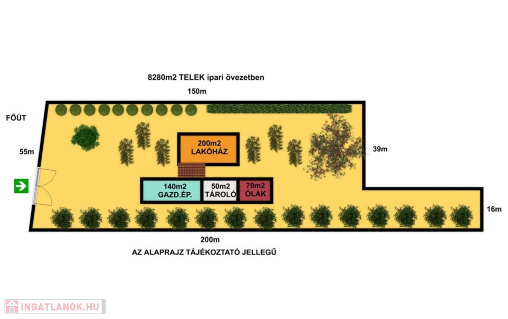 A 8280 m²-es mezőgazdasági, ipari és lakhatási célra is kiváló adottságú körülkerített birtok, amely ipari-gazdasági övezetben fekszik, 50%-os beépíthetőségi lehetőséggel bír, főútvonalhoz közvetlen kapcsolódik, több épületből áll: