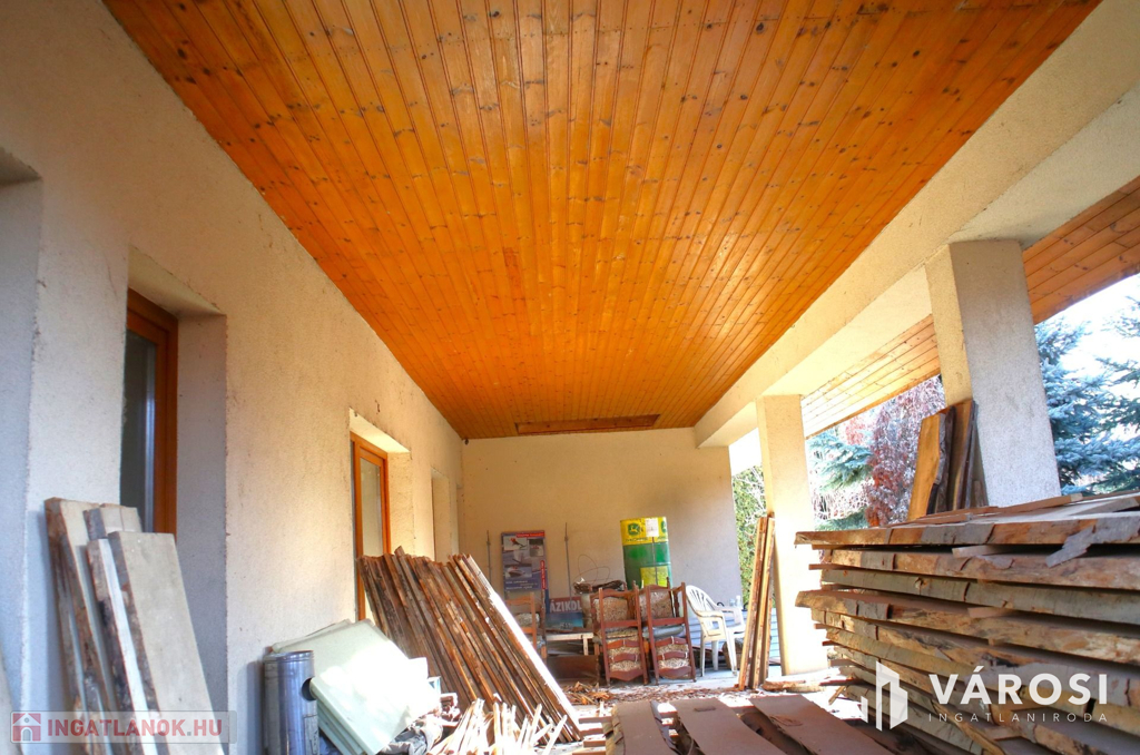 + 50m2-es fedett terasz oszlopokkal, mennyezetét borovi fenyővel burkolták,