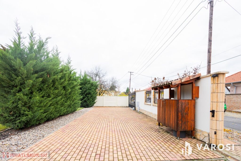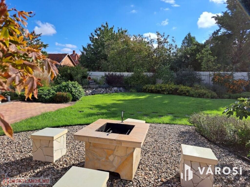 A tágas kertben a fedett terasz és gyermekjátszó mellett egy filagória is megtalálható, melyben szalonnasütő és grillező is ki lett alakítva. A duplatelken egy kertitó és számos dísznövény is helyet kapott, ez utóbbi öntözése fúrott kútról működtetett öntözőrendszerrel megoldott. Emellett 8 autó számára alkalmas beálló is kialakításra került. A telek méretéből adódóan igénytől függően további beépítésre is lehetőség van.