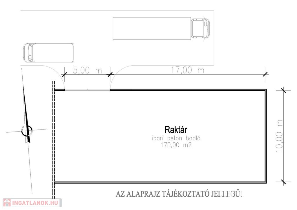 Kiadó 170,00 m2 alapterületű raktár csarnok. Az aljzat glettelt ipari betonpadló, fal-, tetőszerkezet hőszigetelt szendvics panel acélkeret tartószerkezeten, beton lábazattal. Tolókapu mérete 5,00 x 4,3 m, a csarnok belmagassága: 4,90 m - 6,15 m.