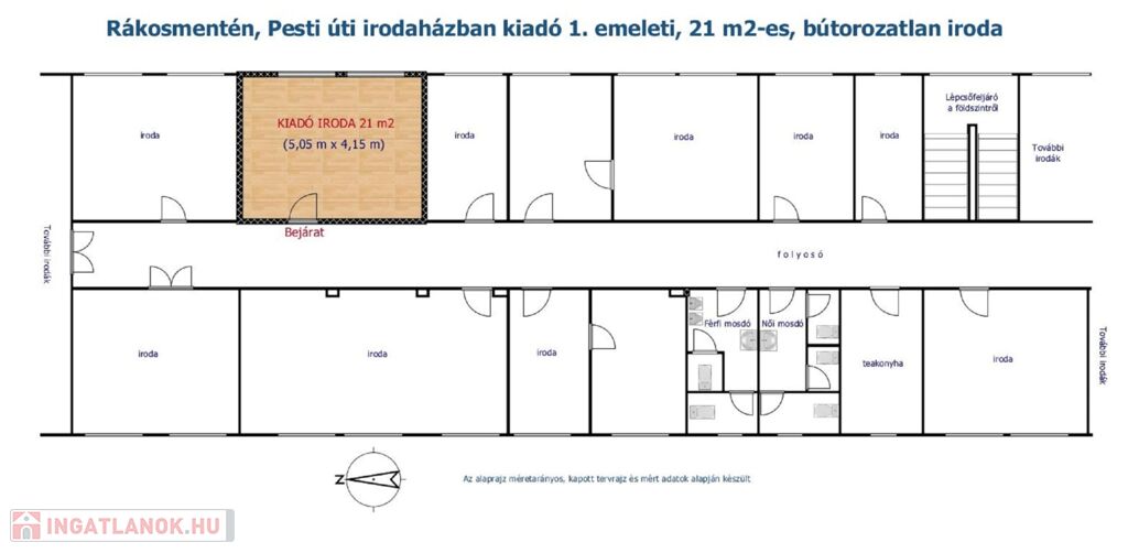 Az iroda egyetlen helyiségből áll, elhelyezkedése az alaprajz szerinti, bútorozatlanul kerül kiadásra.