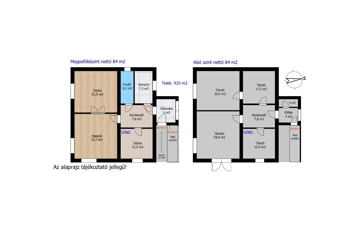 2 szintes, felső szint és alsó szint egyaránt nettó 84 m2, utóbbi 2,2 méter belmagassággal bír, mely jelenleg tárolóként, kazánház, garázsként funkcionál (Kérem, tekintse meg az alaprajzokat!)