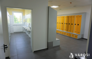 A 410m2-es fejépületben foglalnak helyet az irodák, központi gépészeti és szociális egységek, öltözők és az étkező.