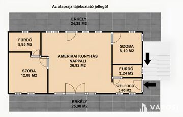 A 37 m²-es amerikai konyhás nappali tágas és világos, tökéletes közösségi tér. A két különálló hálószoba biztosítja a privát szférát. Két fürdőszobával rendelkezik, ami kényelmes mind családok, mind vendégek számára.