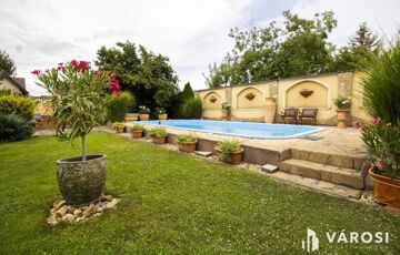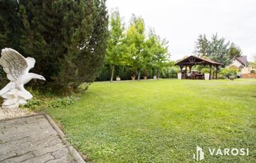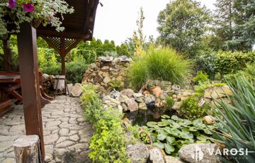A kert maga a kikapcsolódás szigete: profin parkosított első és hátsó kert, 8*4 m-es úszómedence vízforgatóval, tisztítóval, pihenő-, napozóterasszal, hangulatos 20 m²-es kerti pavilon, grillező, kemence, halastó csobogókkal és két fúrt kút is helyet kapott.