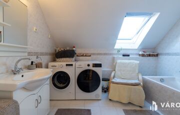 A három éve megújított, modern konyha gáz főzőlappal, elektromos sütővel és beépített mosogatógéppel felszerelt. A fürdőszobában a mosógép és a szárítógép is kényelmesen elfér. A melegvíz-ellátást és a fűtést gázkazán biztosítja.
