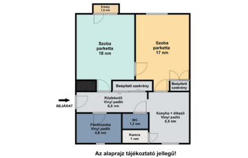 A lakás két külön bejáratú tágas szobából áll (az egyikhez tartozik egy kisebb erkély is), így ideális befektetés vagy kényelmes otthon is lehet pároknak, családoknak illetve diákoknak. A fürdőszoba kádas és a WC külön helyiségben található, a konyha + étkező még egy kis kamrával egészül ki.