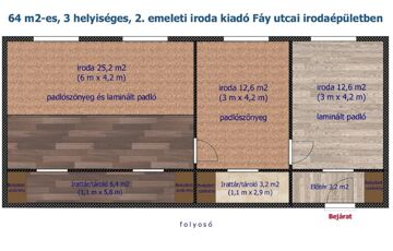 A három egymásból nyíló helyiségből álló iroda az irodaház 2. emeletén helyezkedik el. A helyiségek laminált padlóval, illetve szőnyegpadlóval burkoltak.