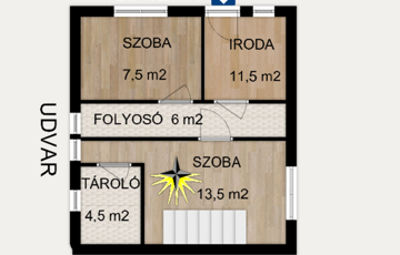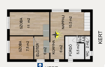 A szobák lamináltpadló burkolatúak, a többi helyiség hidegburkolatú.
