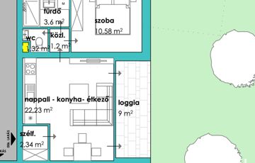 A 1 db amerikai konyhás nappalival, 1db hálószobával, 1 db fürdőszobával, közlekedővel, loggiával rendelkezik.