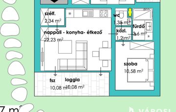 A 1 db amerikai konyhás nappalival, 1db hálószobával, 1 db fürdőszobával, közlekedővel, loggiával rendelkezik.