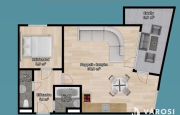 A lakás egy tágas amerikai konyhás nappaliból, egy hálószobából, külön fürdőszobából és WC-ből áll.