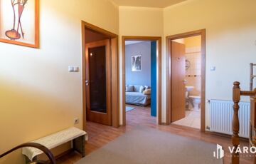 Emelet: Az elegáns falépcsőn elérhető szinten további két hálószoba található, melyek közül az egyik saját terasszal rendelkezik. A szintet egy igényes, káddal felszerelt fürdőszoba teszi teljessé.