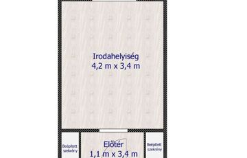 Az alaprajzon látható elrendezésben áll egy irodahelyiségből, valamint egy előtérből, ahol beépített szekrények segítenek abban, hogy az iroda rendezettek maradjon.