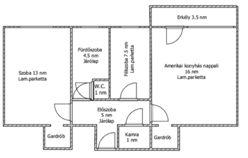 A lakásban amerikai konyhás nappali, 2 hálószoba, fürdőszoba, kamra, előszoba, erkély található.
