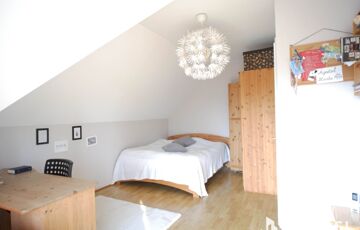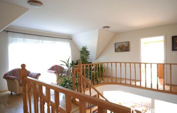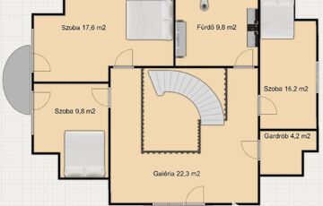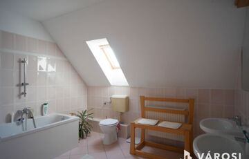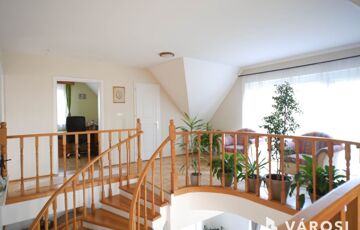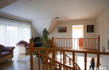Az emeleten három hálószoba, fürdőszoba, gardrób, galéria és két erkély biztosítja a családtagok számára a nyugodt, szeparált életteret.