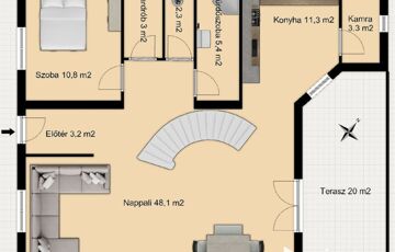 A földszint a mindennapi élet központja, ahol a tágas, kandallós nappali természetes találkozópontként szolgál. Innen közvetlen kapcsolat nyílik az étkezőre és a jól felszerelt konyhára, amely minden igényt kielégít beépített gépeivel, bőséges tárolóival és külön kamrájával. A földszinten ezen felül egy külön szoba, vendégszoba, fürdő, külön WC, gardrób és egy fedett terasz is helyet kapott, amely közvetlenül kapcsolódik a kerthez.